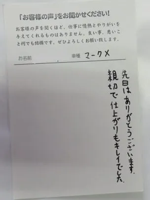 一関の板金塗装修理したお客様より、「親切で仕上がりもキレイでした」と嬉しいコメント頂きました!