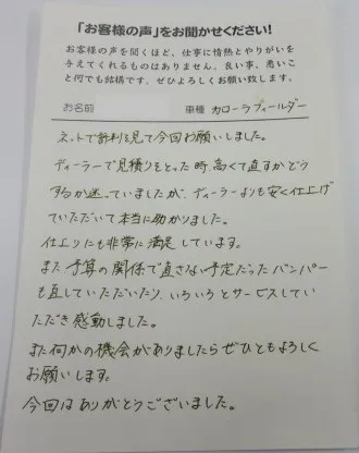 ディーラーで見積もりをとった時高くて直すかどうするか迷っていましたが、ディーラーよりも安く仕上げていただいて本当に助かりました。