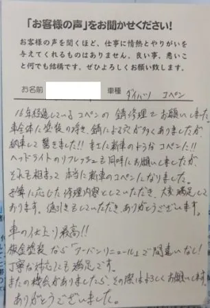 一関市のお客様で板金修理をした際のご感想を頂きました。(ダイハツ・コペン)