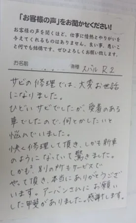 一関市からのお客様で板金修理の感想を頂きました。(スバル・R2)