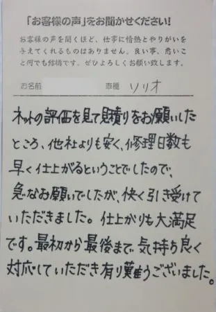 板金修理をしたお客様より修理の感想いただきました。(一関市、スズキ・ソリオバンディット)